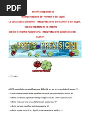Interpretazione Dei Sogni La Smorfia - GitHub Pages Smorfia napoletana lettera f interpretazione dei sogni. Si tratta dell'interpretazione satirica dei numeri e dei sogni, una pratica che di certo ha ben poco, ma che tuttavia è presa in maniera molto seria, diventando la sua osservanza, in alcune circostanze, un'esperienza mistica. 92 rows · numeri della smorfia napoletana da 1 a 90. ... La Smorfia, numeri associati ai sogni e al Lotto - Giochi Lotto La Smorfia napoletana è radicata all'ombra del Vesuvio e si trasmette oralmente da generazioni. Corrisponde ad un' interpretazione tradizionale dei sogni, frutto di un passaparola generato da tutti coloro che, in passato, erano in grado di associare sogni, eventi e ricorrenze a persone o animali. La famosa smorfia napoletana, lettera A - DAIMON SMORFIA NAPOLETANA. A nella scienza onirica questa lettera, se vista chiaramente nel sogno, viene interpretata come buon presagio e come un vicino inizio di imprese utili e favorevoli: 4 , 17 , 35. Abate: vedere un abate fermo: difficoltà per breve periodo di tempo: 31. - che viene verso di voi: tradimento da parte di un amico: 31 , 90.